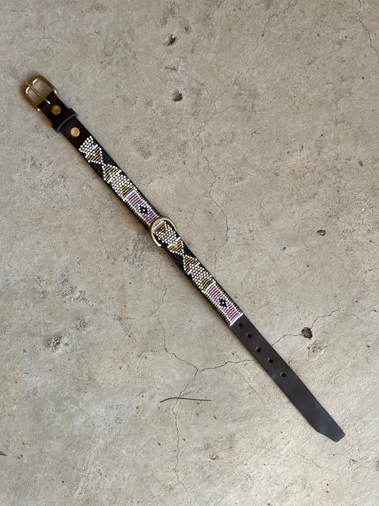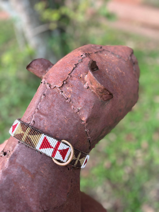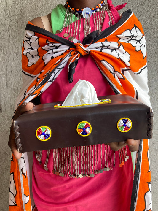 Each and every item is produced in our little studio in the Mara, to a very high standard and we take great pride in what we do. We try not to use any extra metal clasps, hooks, buckles or rivets and we make our own thread for our beading from reused plastic food bags.