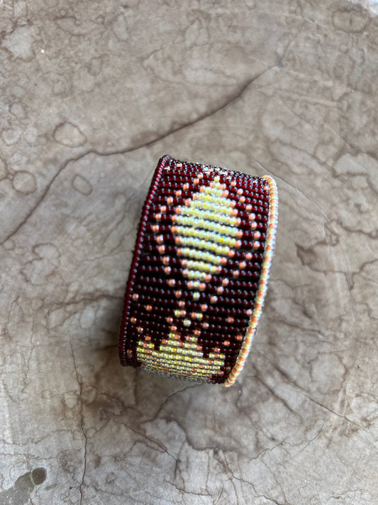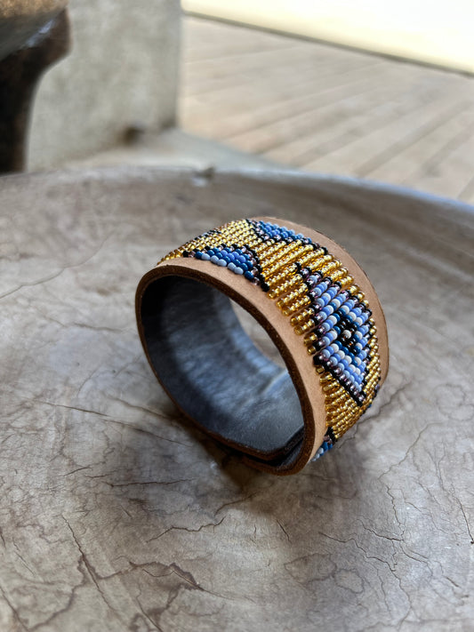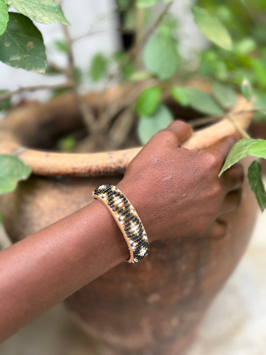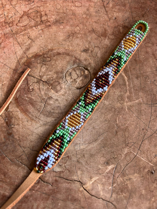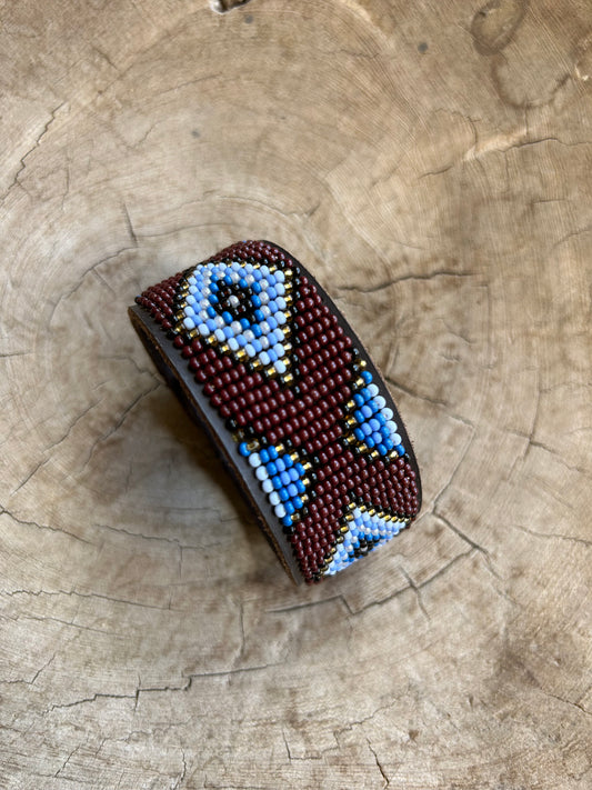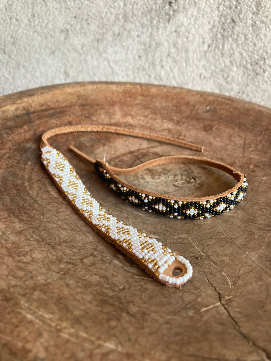 We take great pride in the work we produce and every piece we make is of a very high quality. We try not to use any extra metal clasps, hooks, buckles or rivets and we make our own thread for our beading from reused plastic food bags.