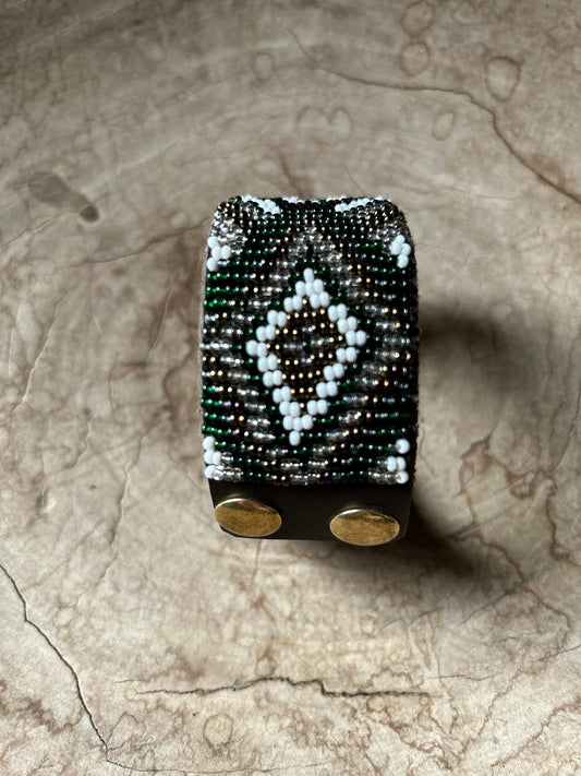 We take great pride in the work we produce and every piece we make is of a very high quality. We try not to use any extra metal clasps, hooks, buckles or rivets and we make our own thread for our beading from reused plastic food bags.
