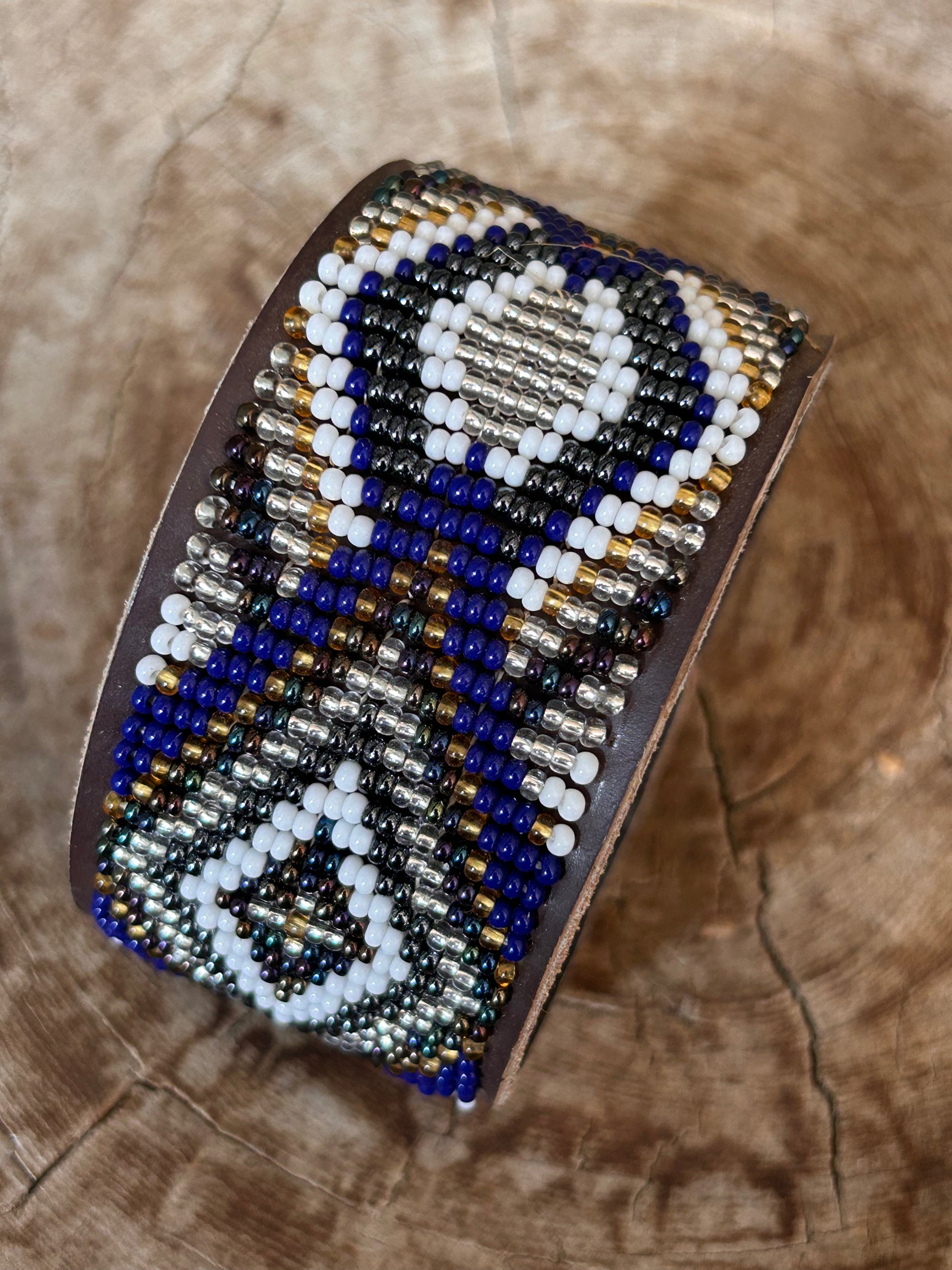 This vibrant beaded cuff features a gorgeous ‘Tattoo’ design in royal blue, black, silver and white, beaded onto soft dark brown leather. It fastens simply with two popper studs.